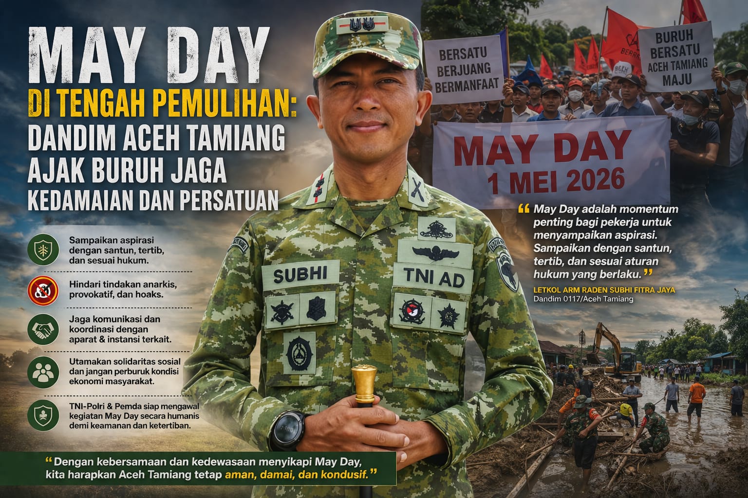 ACEH TAMIANG — Menjelang peringatan Hari Buruh Internasional (May Day) yang jatuh pada 1 Mei 2026, Komandan Kodim 0117/Aceh Tamiang, Raden Subhi Fitra Jaya, mengajak seluruh elemen masyarakat, khususnya para pekerja dan serikat buruh, untuk bersama-sama menjaga keamanan dan ketertiban masyarakat (kamtibmas) agar tetap kondusif.