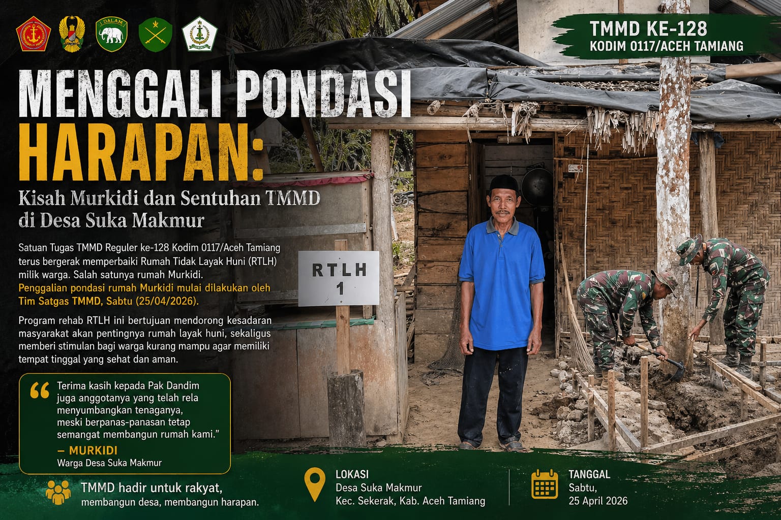 Pagi itu, tanah di halaman rumah Murkidi mulai terbuka. Sekop-sekop prajurit menembus kerasnya bumi, menggali bukan sekadar pondasi, tetapi juga harapan yang lama terpendam. Di Desa Suka Makmur, Sabtu (25/04/2026), derap langkah Satgas TNI Manunggal Membangun Desa (TMMD) Reguler ke-128 Kodim 0117/Aceh Tamiang menjadi tanda bahwa perubahan tengah dimulai.