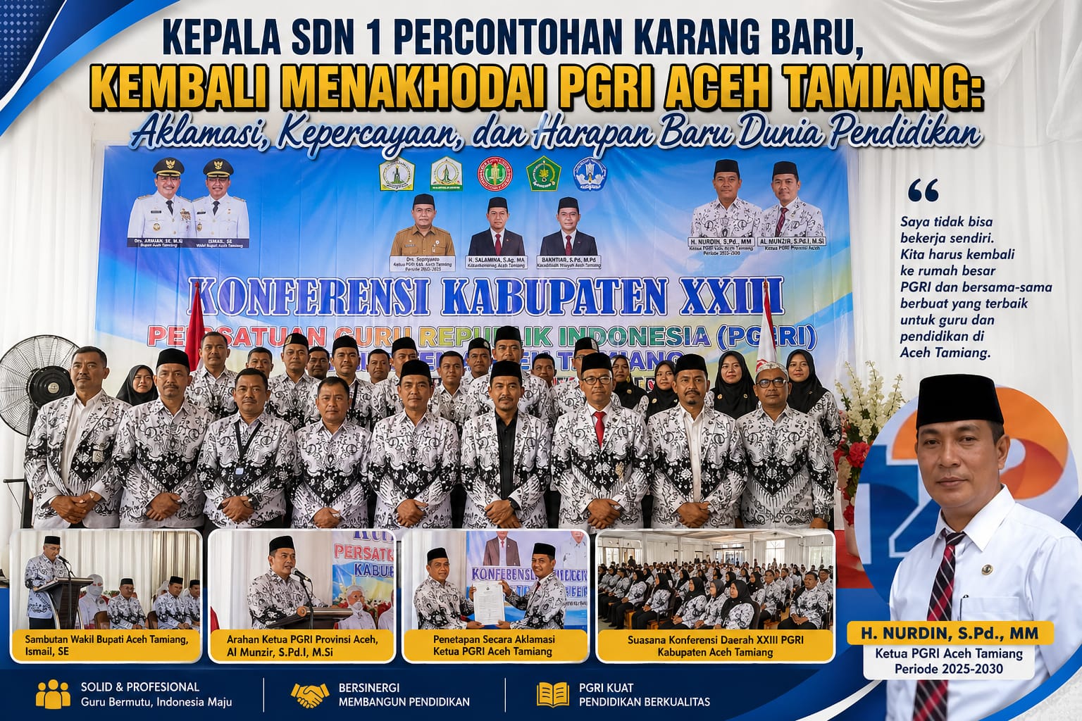 ACEH TAMIANG — Kepercayaan kembali mengalir kepada H. Nurdin, S.Pd., M.M. Kepala SD Negeri 1 Pecontohan Karang Baru itu resmi terpilih secara aklamasi sebagai Ketua Persatuan Guru Republik Indonesia (PGRI) Kabupaten Aceh Tamiang untuk periode 2025–2030. Terpilihnya Nurdin untuk kedua kalinya menjadi penanda kuat bahwa kepemimpinannya masih dibutuhkan dalam mengawal arah perjuangan guru di daerah tersebut.