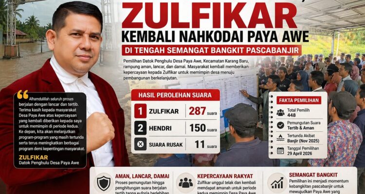 Semangat Bangkit Pascabanjir, Zulfikar Lanjut Dua Periode Nahkodai Paya Awe Daerah, Pemerintah|April 29, 2026oleh Tim Redaksi ACEH TAMIANG — Suasana demokrasi yang damai dan penuh kedewasaan mewarnai pelaksanaan